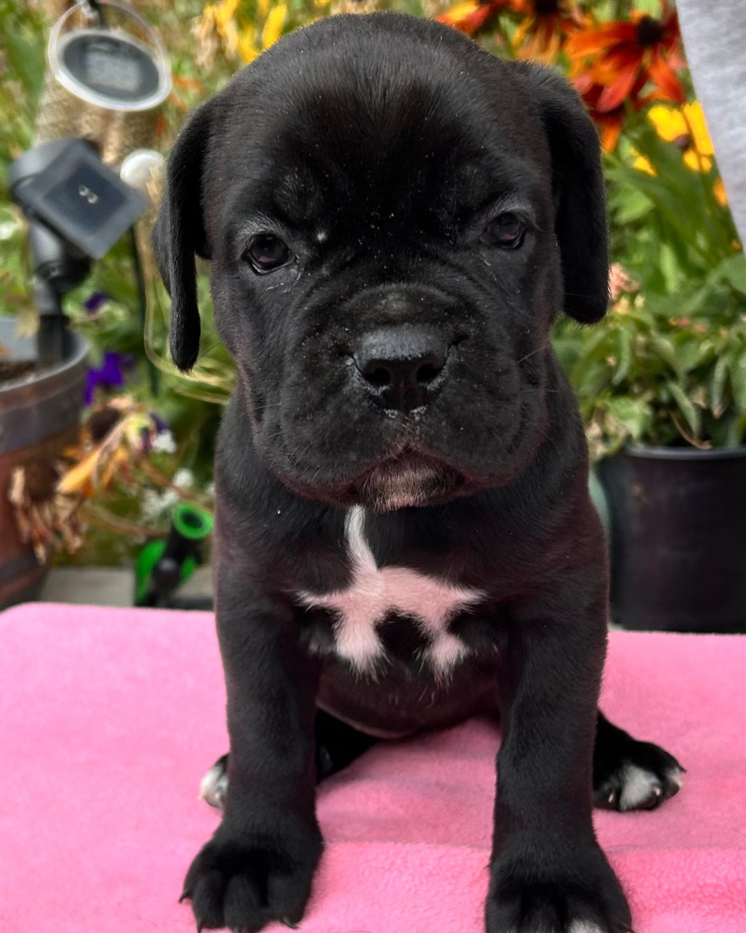 Black coat with white markings on chest, looks just like dad. Eyes and brindle from mom. Great temperaments.